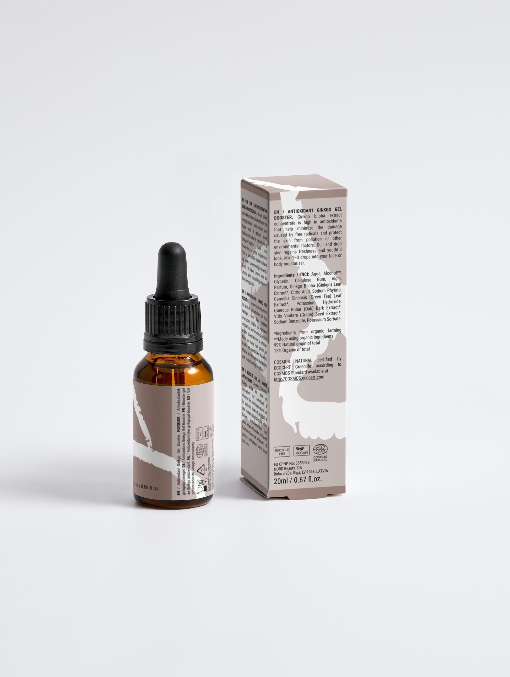 Ginkgo biloba extract concentrate is high in antioxidants that help minimize the damage caused by free radicals and protect the skin from pollution or other environmental factors. Dull and tired skin regains freshness and youthful look. Mix 1–3 drops into your face or body moisturiser.